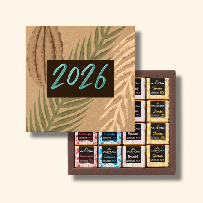 Ce coffret de 160 grammes contient 32 carrés de chocolat noir et au lait Valrhona, offrant une sélection de quatre variétés distinctes pour satisfaire tous les palais. Chaque carré de chocolat est élaboré à partir de fèves de cacao 100% tracées jusqu'aux producteurs, pour plus de transparence. De plus, le packaging de ce coffret est éco-conçu, reflétant les engagements écologiques de la Maison Valrhona.