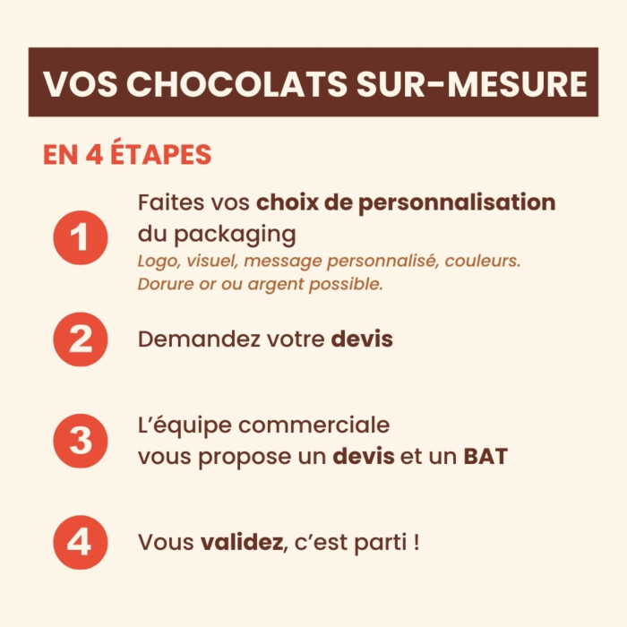 La personnalisation de ce coffret d'amandes et de noisettes enrobées de chocolat noir et lait est disponible pour tous nos clients : CSE, associations et entreprises. Elle est possible à partir de 84 coffrets commandés, ce qui correspond à 7 cartons de 12 coffrets de chocolat. Le délai de réalisation, incluant la création et la livraison de votre projet est estimé entre 6 à 8 semaines.