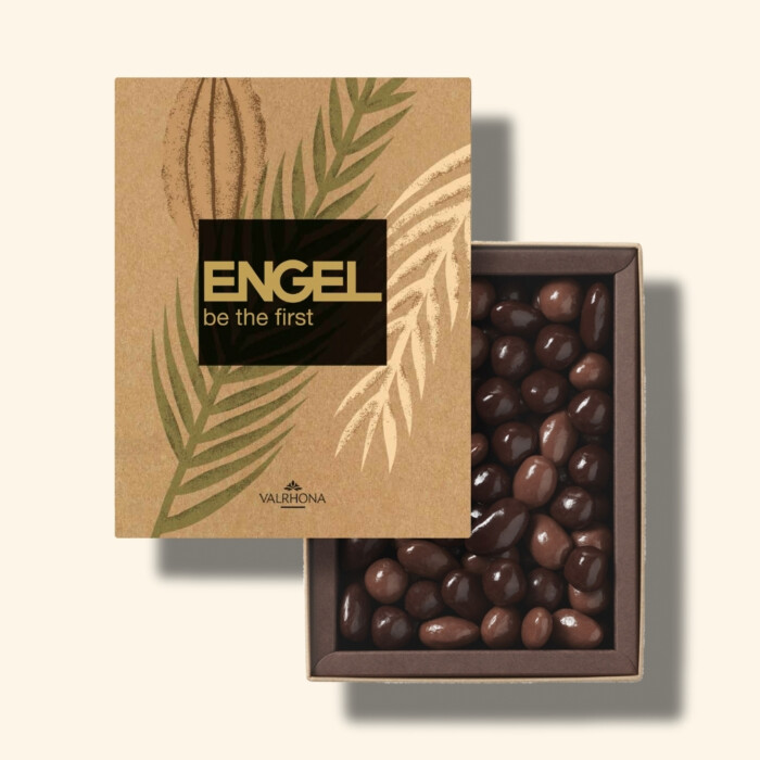 Ce coffret de 230 grammes contient des amandes et noisettes enrobées de chocolat noir et lait Valrhona. Les amandes et noisettes, soigneusement cultivées en Europe, sont choisies pour leurs caractéristiques exceptionnelles. Après une torréfaction méticuleuse, elles sont enveloppées de chocolat Valrhona. L'enrobage des noisettes et des amandes se fait par turbinage, dans de vastes cuves en cuivre. En tournant sur elles-mêmes, ces cuves assurent un brassage optimal des fruits secs, les recouvrant uniformément de chocolat.