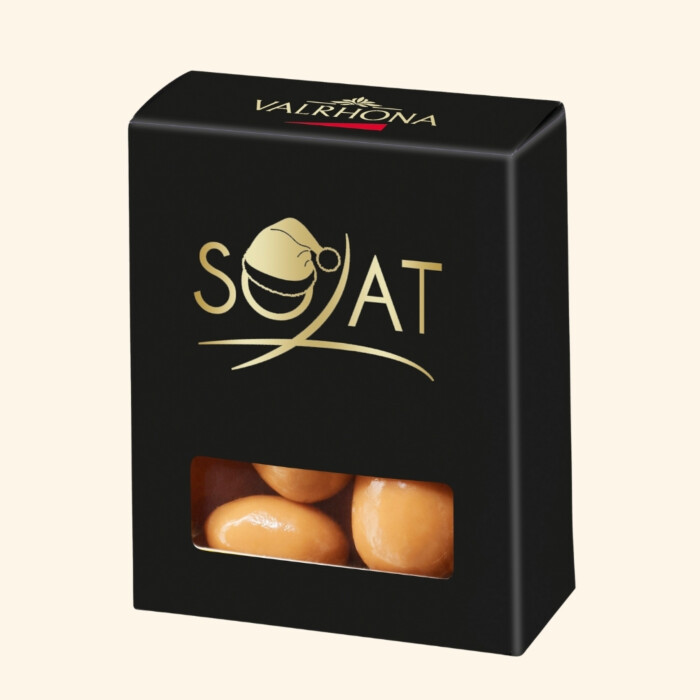 Personnalisation du packaging : le coffret conserve son écrin noir. Votre logo ou message est apposé sur la face avant grâce à une dorure à chaud, un procédé artisanal réalisé à la main, individuellement, dans les ateliers de Valrhona. Ce travail minutieux permet un rendu haut de gamme, avec un choix de dorure or ou argent pour une finition élégante et personnalisée.