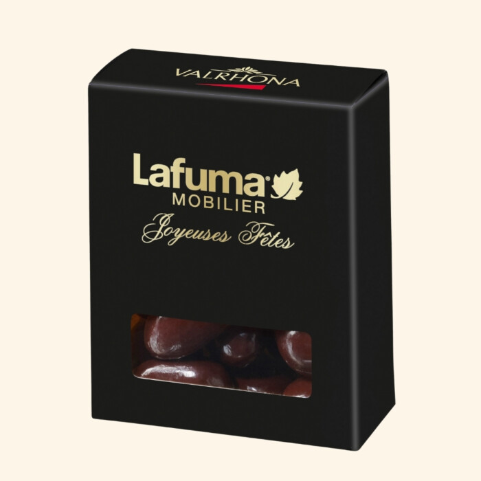 Personnalisation du packaging : le coffret conserve son écrin noir. Votre logo ou message est apposé sur la face avant grâce à une dorure à chaud, un procédé artisanal réalisé à la main, individuellement, dans les ateliers de Valrhona. Ce travail minutieux permet un rendu haut de gamme, avec un choix de dorure or ou argent pour une finition élégante et personnalisée.