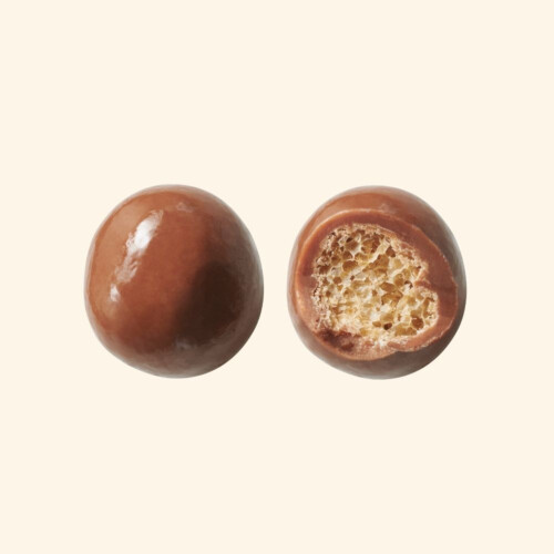 sucre, beurre de cacao, céréales maltées croustillantes 18,2% (farine de BLÉ, saccharose, farine de BLE malté, amidon de BLÉ, extrait de malt d'ORGE, LAIT écrémé en poudre, sel), caramel (LAIT écrémé, lactoserum (LAIT), sucre, beurre (LAIT), arôme naturel), LAIT entier en poudre, fèves de cacao, maltodextrine, émulsifiant: lécithine de tournesol, agent d'enrobage: gomme shellac