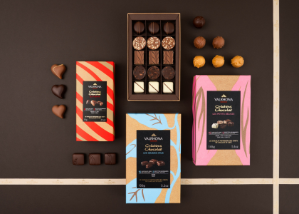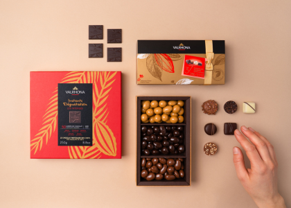 Coffret d'amandes, noisettes et croustibilles enrobées généreusement de chocolat noir et lait