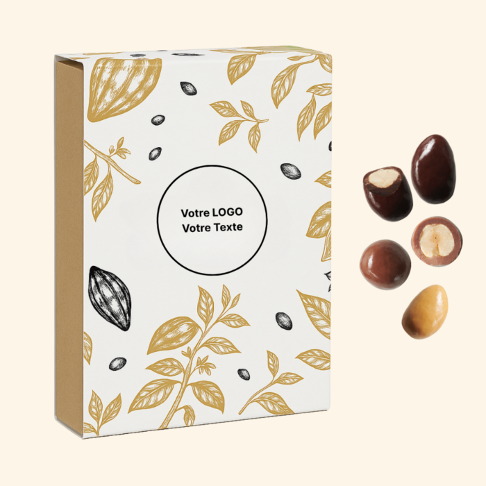 Coffret amandes et noisettes enrobées trois chocolats avec fourreau personnalisable