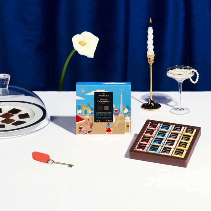 Ce coffret de 160 grammes contient 32 carrés de chocolat noir et au lait Valrhona, offrant une sélection de quatre variétés distinctes pour satisfaire tous les palais. Chaque carré de chocolat est élaboré à partir de fèves de cacao 100% tracées jusqu'aux producteurs, pour plus de transparence. De plus, le packaging de ce coffret sur le thème de Paris est éco-conçu, reflétant les engagements écologiques de la Maison Valrhona.