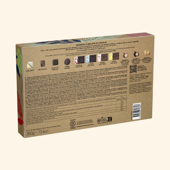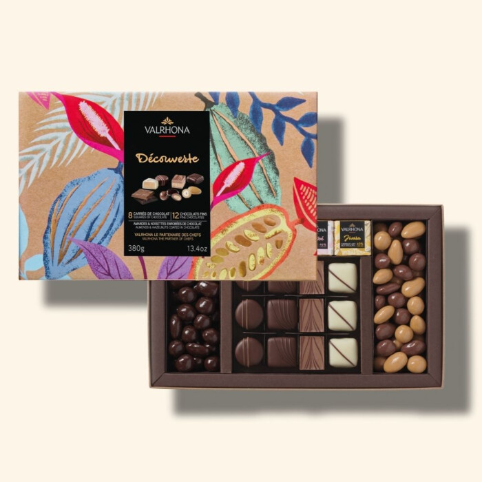 - Coffret regroupant les meilleurs produits de la maison Valrhona : bonbons de chocolat, carrés noir et lait, amandes et noisettes enrobées de chocolat noir, lait et Dulcey