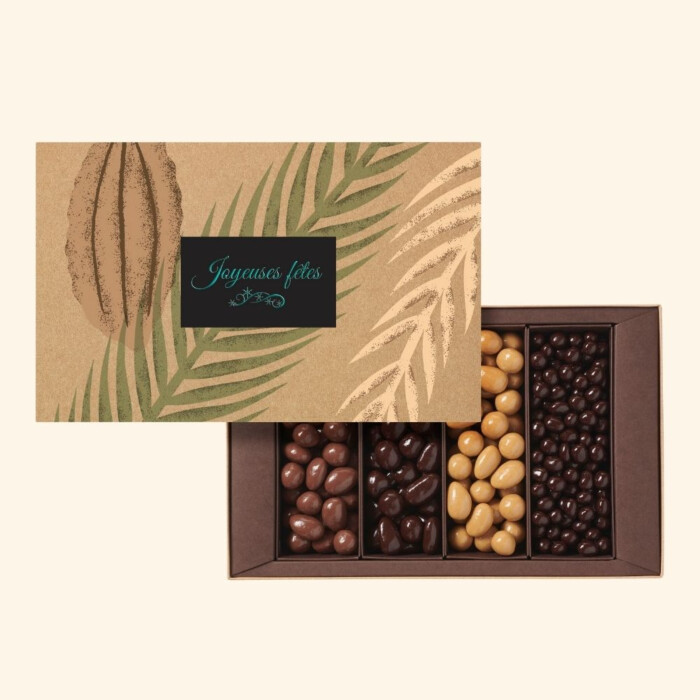 Ce coffret de 450 grammes contient 4 compartiments, renfermant des amandes et noisettes enrobées de chocolat noir, lait et blond Dulcey ainsi que des petites orangettes enrobées de chocolat noir. Ces gourmandises à croquer sont confectionnées à base d'ingrédients de haute qualité et sont la preuve d'un savoir-faire français, artisanal et ancestral.
