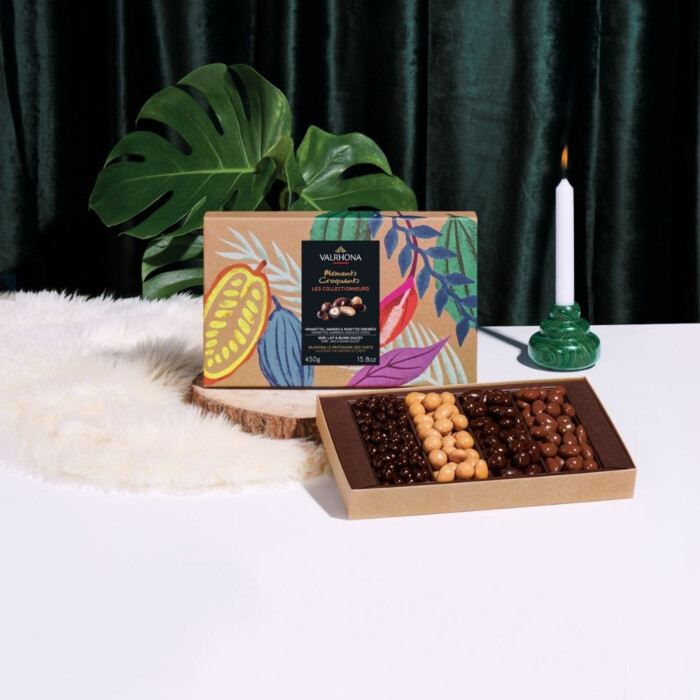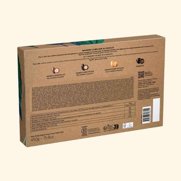 Ce coffret de 450 grammes contient 4 compartiments, renfermant des amandes et noisettes enrobées de chocolat noir, lait et blond Dulcey ainsi que des petites orangettes enrobées de chocolat noir. Ces gourmandises à croquer sont confectionnées à base d'ingrédients de haute qualité et sont la preuve d'un savoir-faire français, artisanal et ancestral.