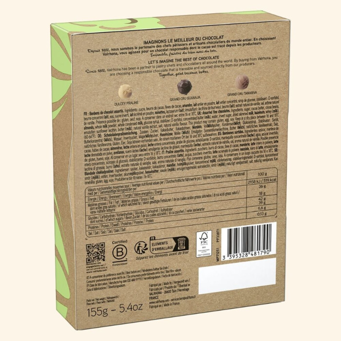 Ce coffret de 155 grammes contient 12 truffes en chocolat de 3 recettes différentes : 4 truffes garnies d'une ganache au chocolat noir Guanaja 70%, 4 truffes ganache au chocolat au lait Tanariva % et enfin, 4 truffes ganache Dulcey 35% praliné. Ces gourmandises à croquer sont confectionnées avec des ingrédients de haute qualité et sont la preuve d'un savoir-faire français, artisanal et ancestral.