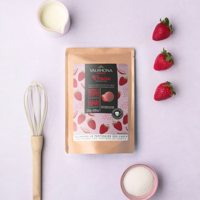 sucre, beurre de cacao 37,9%, fraises en poudre 14,2%, émulsifiant : lécithine de tournesol.