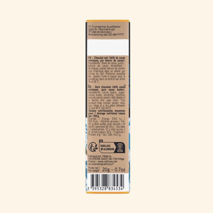 Chocolat noir (66% de cacao minimum, pur beurre de cacao).