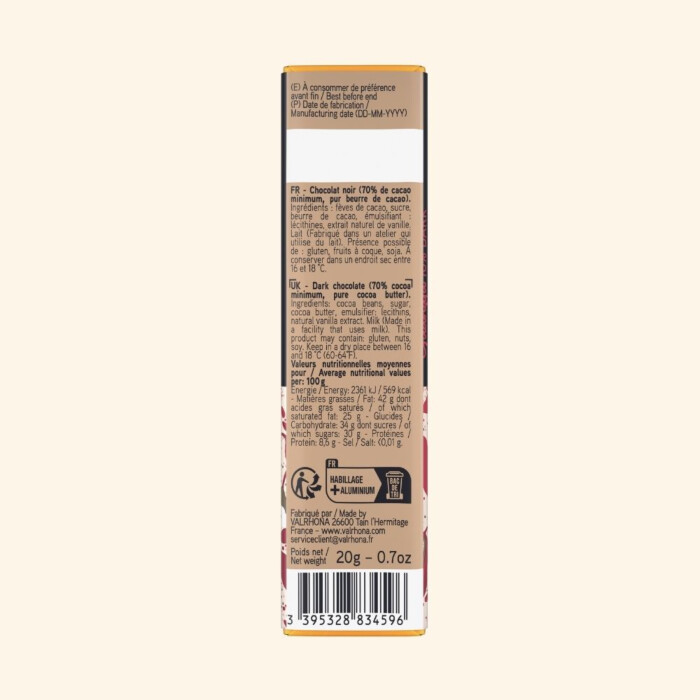 Chocolat noir (70% de cacao minimum, pur beurre de cacao).