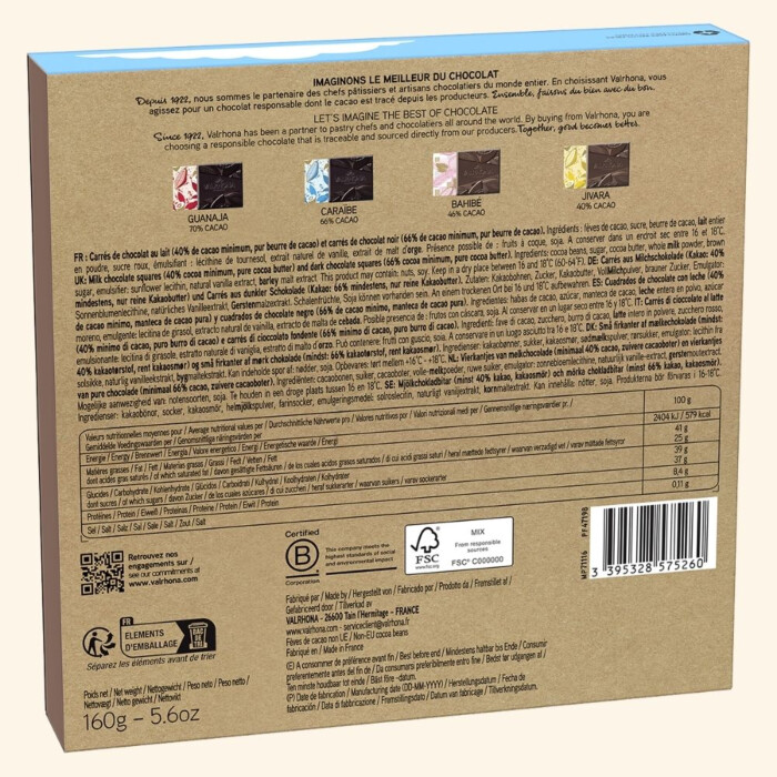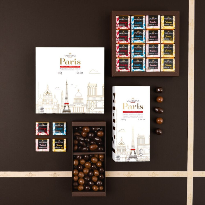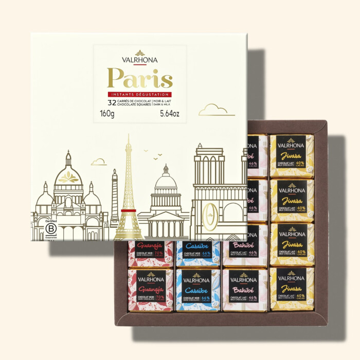 Ce coffret de 160 grammes contient 32 carrés de chocolat noir et au lait Valrhona, offrant une sélection de quatre variétés distinctes pour satisfaire tous les palais. Chaque carré de chocolat est élaboré à partir de fèves de cacao 100% tracées jusqu'aux producteurs, pour plus de transparence. De plus, le packaging de ce coffret sur le thème de Paris est éco-conçu, reflétant les engagements écologiques de la Maison Valrhona.