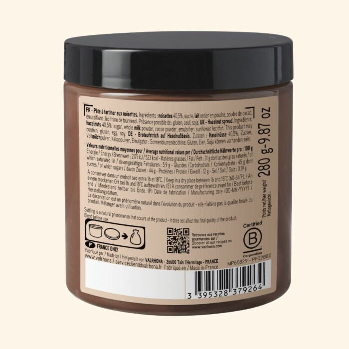 NOISETTES 40,5%, sucre, LAIT entier en poudre, poudre de cacao, émulsifiant : lécithine de tournesol.