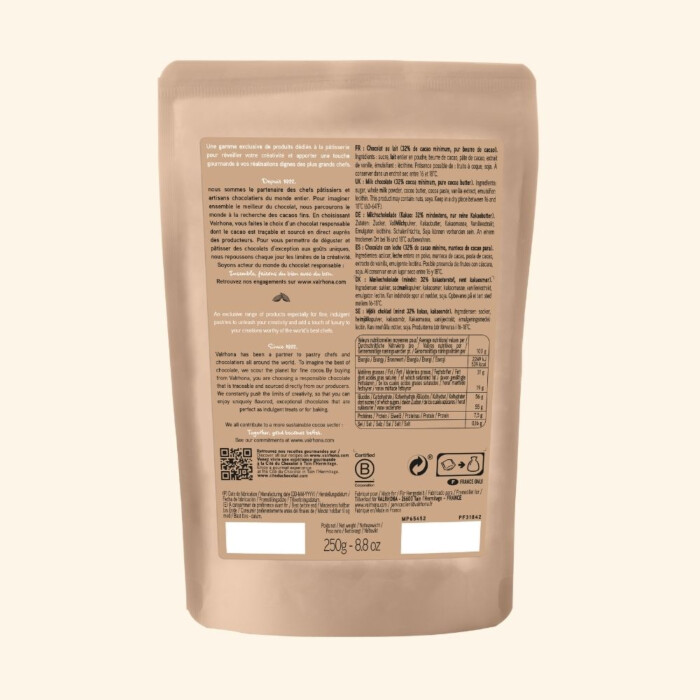 - Chocolat au lait (32% de cacao minimum, pur beurre de cacao).