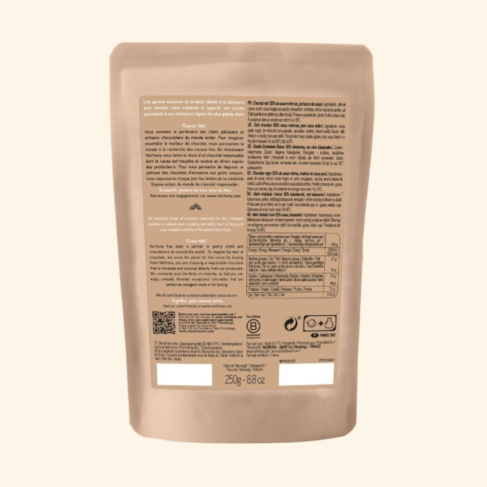 - Chocolat noir (52% de cacao minimum, pur beurre de cacao).
