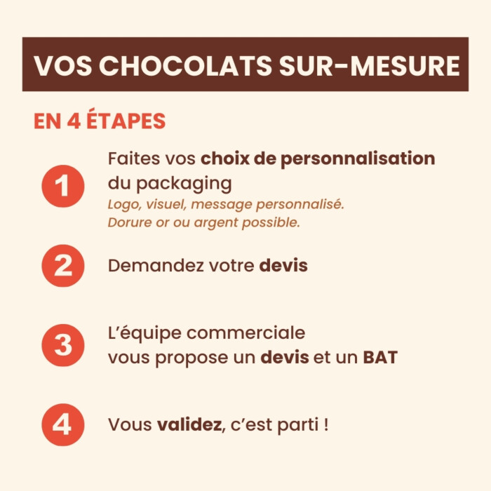 La personnalisation de cet assortiment d'amandes et de noisettes enrobées de chocolat est disponible pour tous nos clients : CSE, associations et entreprises. Elle est possible à partir de 88 coffrets commandés, soit 11 cartons de 8 coffrets de chocolat. Le délai de réalisation, incluant la création et la livraison de votre projet est estimé entre 6 à 8 semaines.