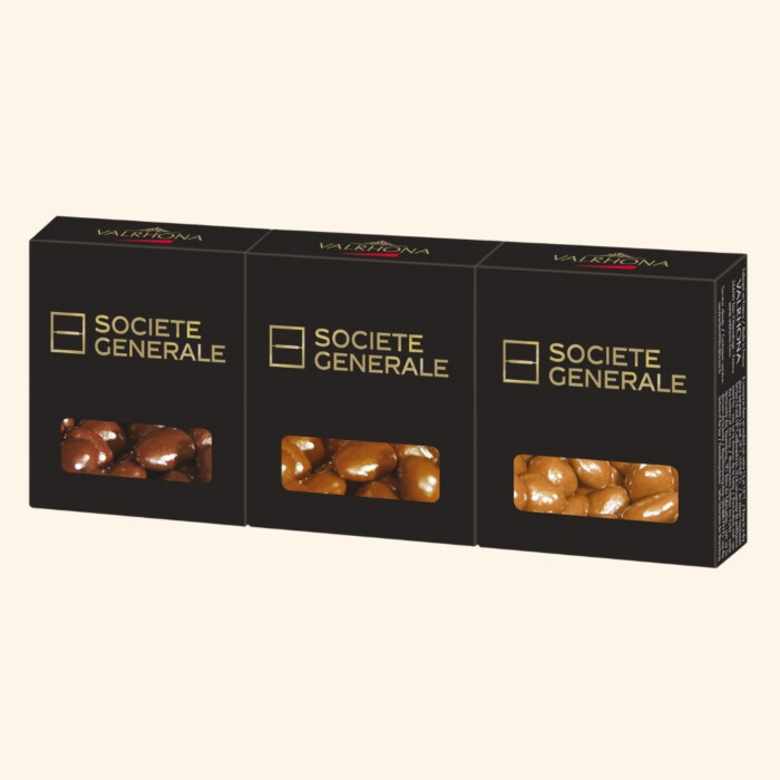 Ce tripack se compose de 3 coffrets de 50 grammes, chacun contenant des amandes et noisettes enrobées de trois chocolats différents : dans l'un du chocolat noir, dans le second du chocolat au lait et enfin du chocolat blond Dulcey. Les amandes et noisettes, soigneusement cultivées en Europe, sont choisies pour leurs caractéristiques exceptionnelles. Après une torréfaction méticuleuse, elles sont enveloppées de chocolat Valrhona. L'enrobage des noisettes et des amandes se fait par turbinage, dans de vastes cuves en cuivre. En tournant sur elles-mêmes, ces cuves assurent un brassage optimal des fruits secs, les recouvrant uniformément de chocolat.